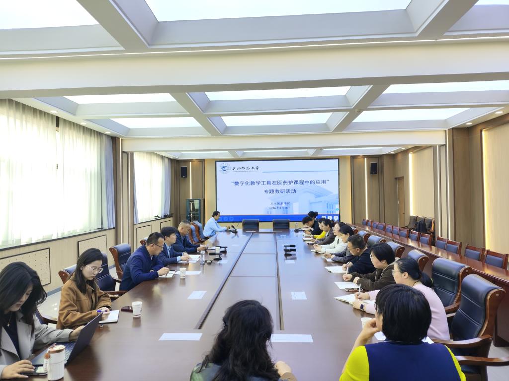 为深入推进教育数字化转型,推动人工智能与医药护课程教学深度融合,4月16日下午,卫生健康学院在北校区教学楼3楼会议室举办“数字化教学工具在医药护课程中的应用”专题教研活动。活动由教务处副处长谢小虎主持,超星公司培训师、教务处工作人员、学院全体授课教师及天水市卫生学校教师代表参加。 本次教研活动设置平台培训、教学设计分享、交流研讨三大环节,形成完整教研闭环。培训中,超星工程师现场演示在线课...