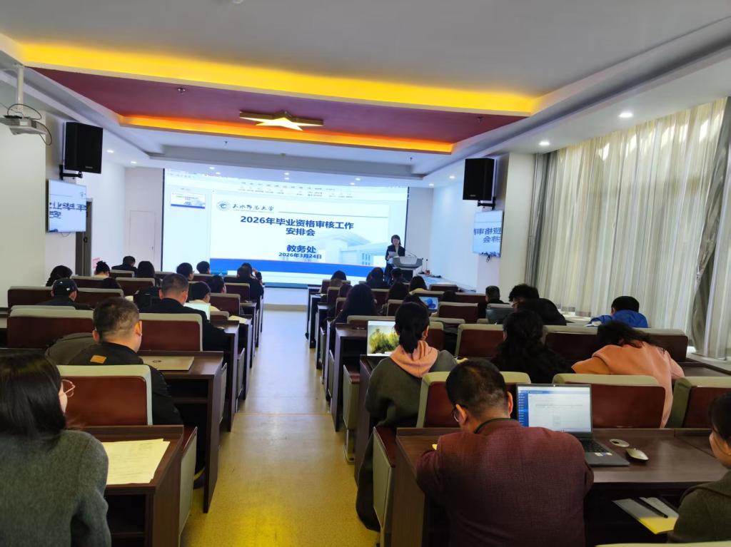为扎实推进2026届毕业生毕业资格审核各项工作,进一步规范审核流程、压实岗位职责、提升工作质效,3月24日上午,教务处在马克思主义学院报告厅118室召开毕业资格审核工作专题会议。教务处副处长谢小虎主持会议,各二级学院教学副院长、教务干事及教务处相关科室工作人员参会。